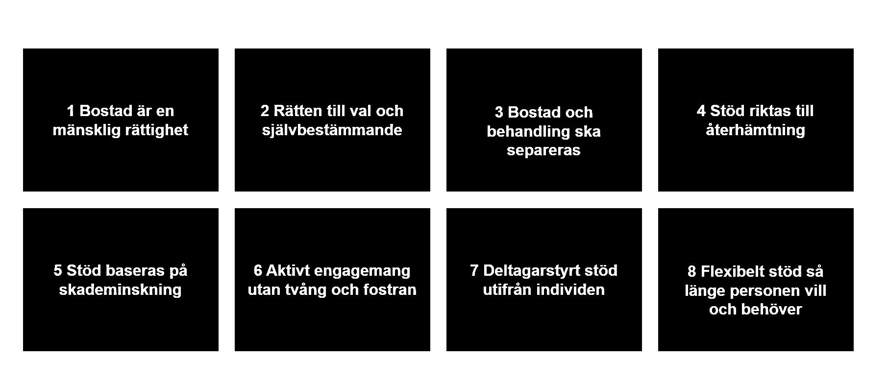 För att framgångsrikt implementera Bostad Först och uppnå hållbart kvarboende är det nödvändigt att arbeta metodtroget utifrån de åtta grundprinciperna.